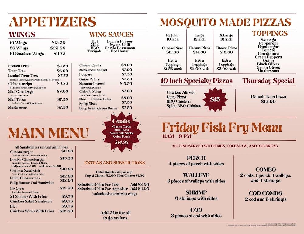 The menu at C & C's Mosquito Inn offers a variety of delicious options focusing on simplicity and tradition. Highlights include juicy burgers, hearty sandwiches, and savory fish plates, appealing to diverse tastes. Popular items like the double cheeseburger and belly buster cod sandwich seldom disappoint.